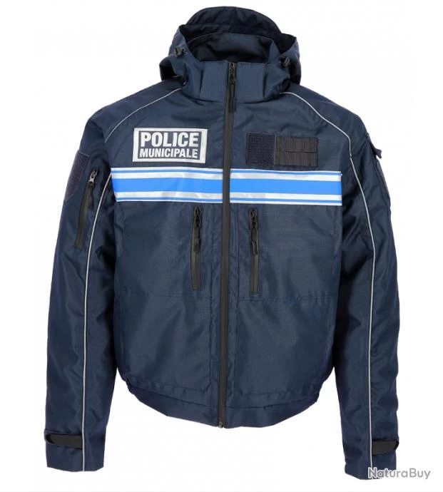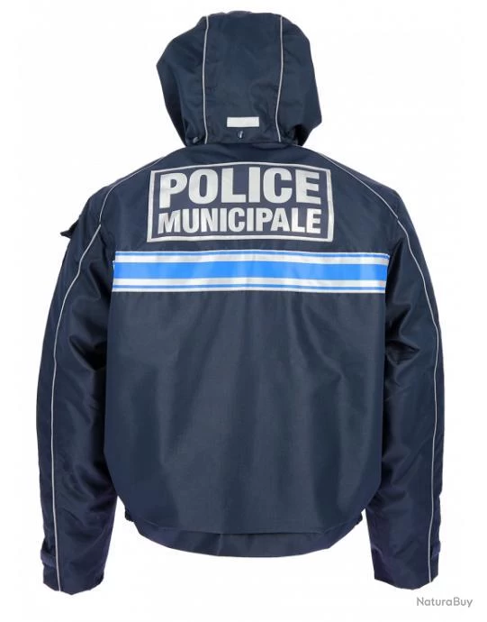 Triple bande bleu gitane et flaps «POLICE MUNICIPALE» rétro-réfléchissants devant et dos, porte-radio en double passant Molle et galon grade velcro à la poitrine