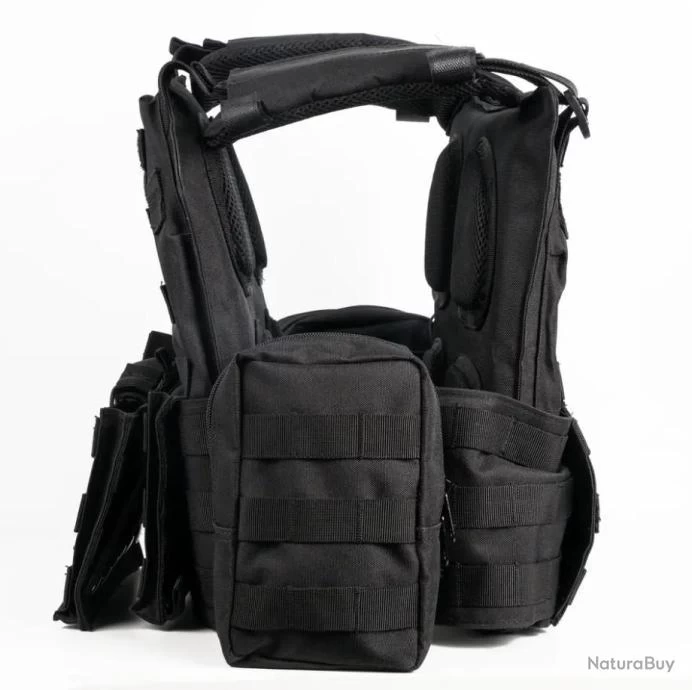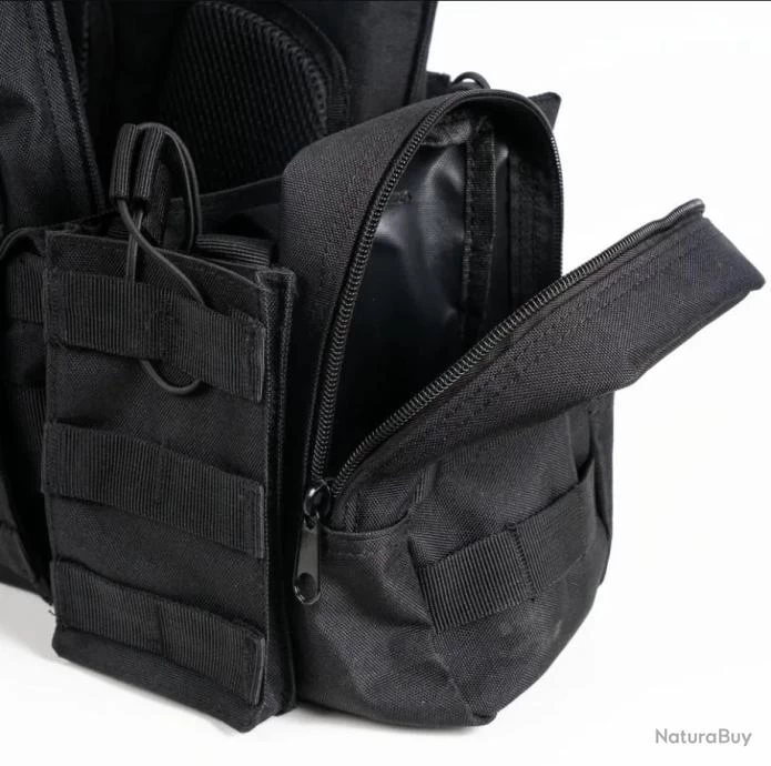 – Compatible avec le système MOLLE (permet de fixer de l’équipement et des accessoires sur le gilet : porte chargeur, trousse de secours, etc..).