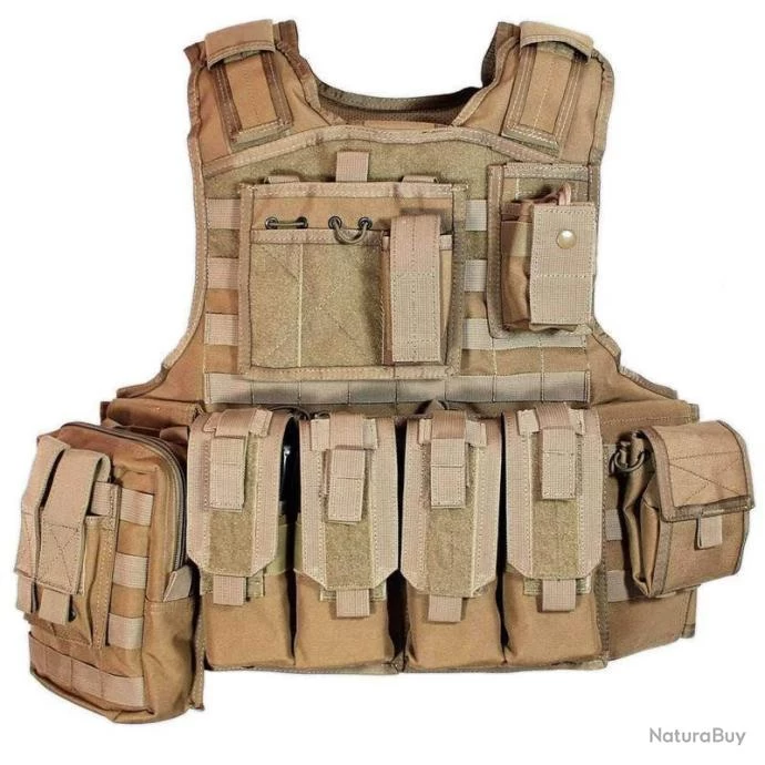 - Contenu: 2 porte-chargeurs doubles fermés amovibles pour chargeurs type M4, AK47, 2 porte-chargeurs doubles fermés intégrés pour chargeurs type M4, AK47,1 grande poche utilitaire verticale MOLLE, 1 porte-grenade double pour fumigène ou 40 mm, panneau d’administration MOLLE, 1 porte-radio pour petite radio type Midland, 1 porte-chargeur double pour chargeur de PA, 1 pochette fourre-tout repliable,1 pochette sur le dos pour réservoir d’hydratation de 3L
