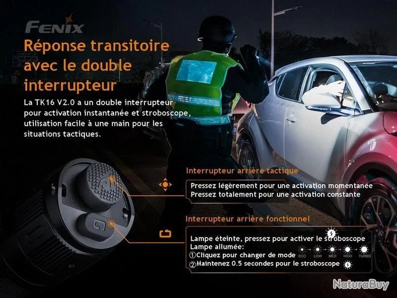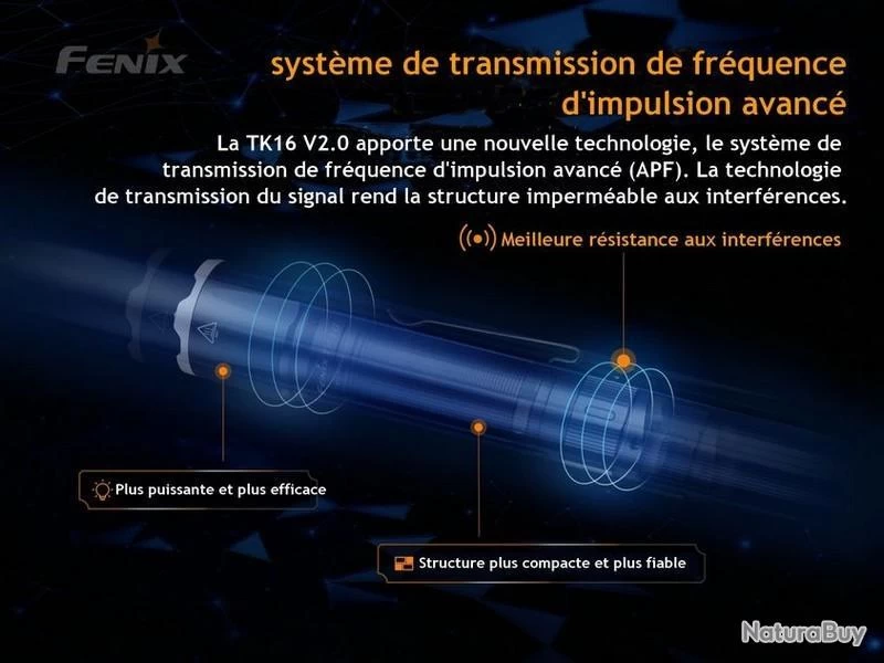 L’APF (Advanced Pulse-Frequency Transmission System) unique de la Fenix rend la structure plus compacte et accentue ses capacités tactiques. La TK16 V2.0 a un double interrupteur arrière tactique pour une activation instantanée du stroboscope.