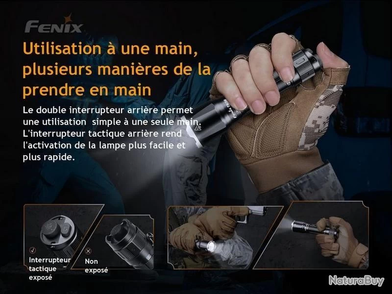 Allumage momentané : Appuyez légèrement et rester appuyez sur le bouton Tactique dès que vous lâcherez, la lampe s’éteindra.