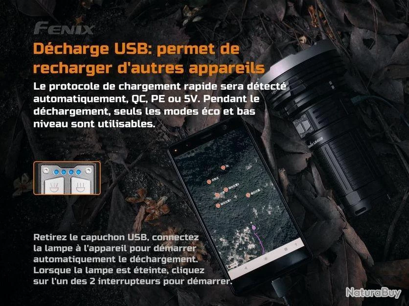 – Mode Turbo 12 000 lumens sur une portée de 410m jusqu’a 45 min