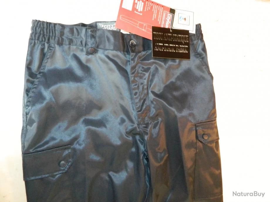 Pantalon d’intervention – sécurité couleur bleu marine de marque CITY GUARD, 35% coton 63% polyester + 2% fil métallique; tissu anti-statique, déperlant, anti-tache. 2 poches mains, 2 poches cargo; élastique à la taille et en bas des jambes, passants de ceinture à pression. Taille 46.