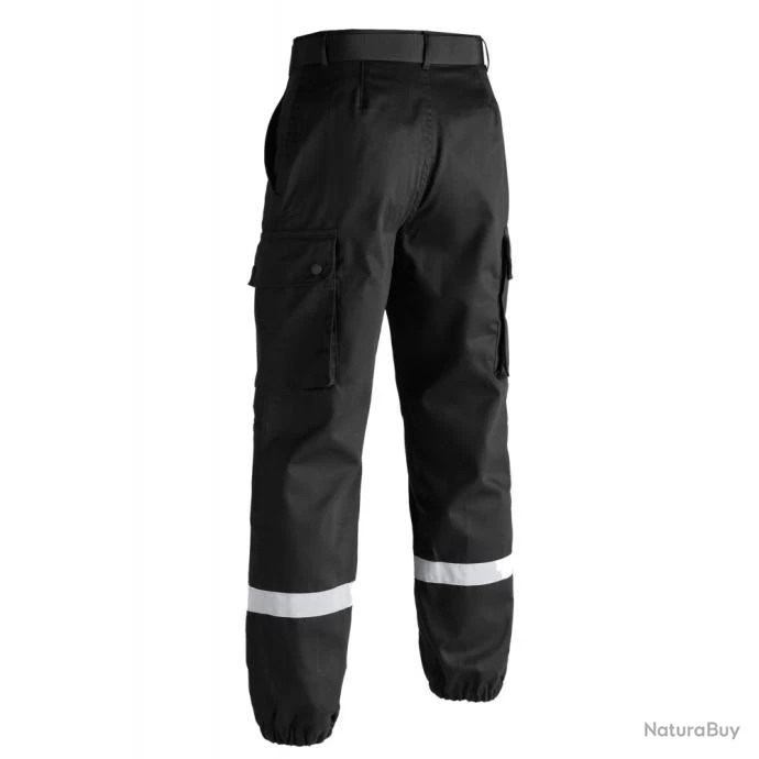 Pantalon noir type F2 avec bandes rétro-réfléchissantes au niveau des jambes.