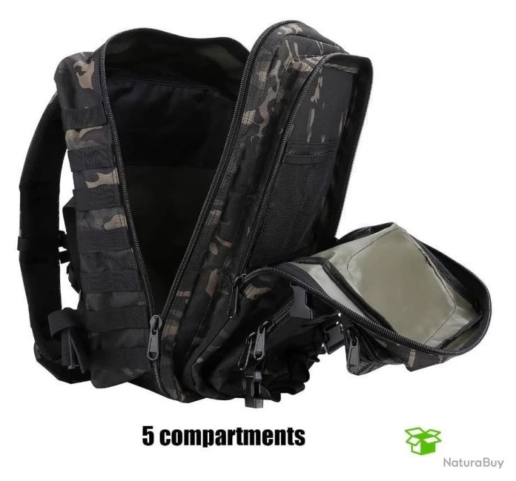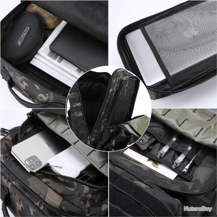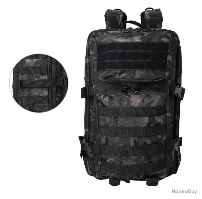 Sangle d’épaule, poignée de transport haut, sangles de compression latérale, les poches avec une fermeture éclair bidirectionnelle, sangles de poitrine permettent de bien gérer le poids.