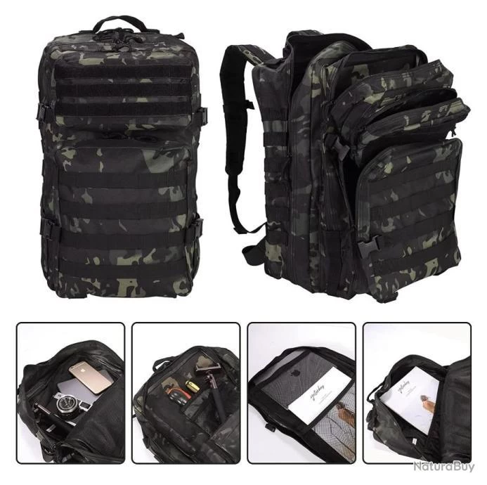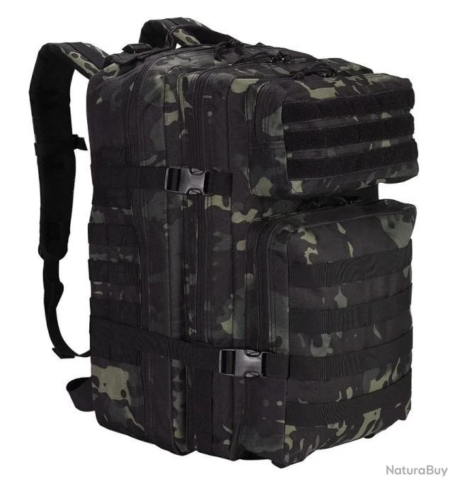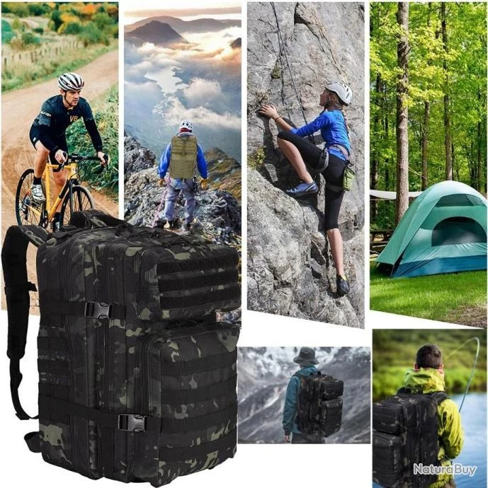 Sac à Dos Tactique Militaire 45L Chasse Pêche Randonnée Camping Escalade Camouflage Noir