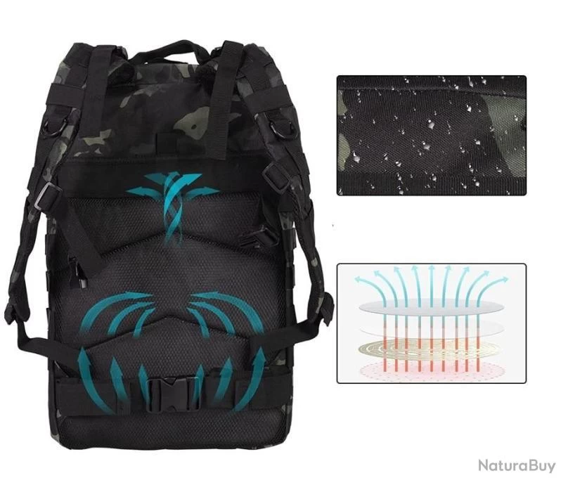 Sac à dos tactique de grande capacité 45 L, dimensions environ 28 x 28 x 48 cm, fabriqué en matériau durable et résistant à l’eau, pour garder votre équipement de plein air à sec.