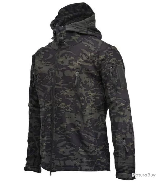 Veste à Capuche Militaire Imperméable Ultra Résistante Coupe Vent Camping Randonnée Chasse Noir Camo